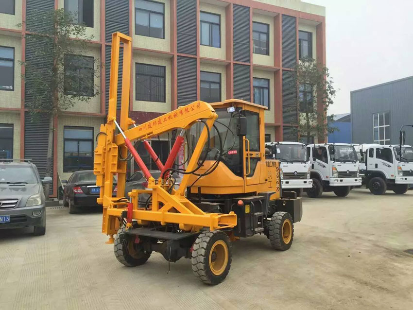 廠房院壩內(nèi)銷售的一臺公路護欄打樁機客戶正要開上工地使用