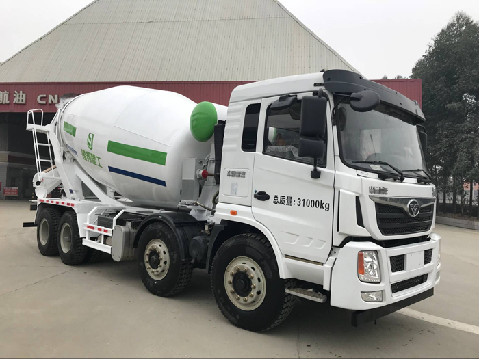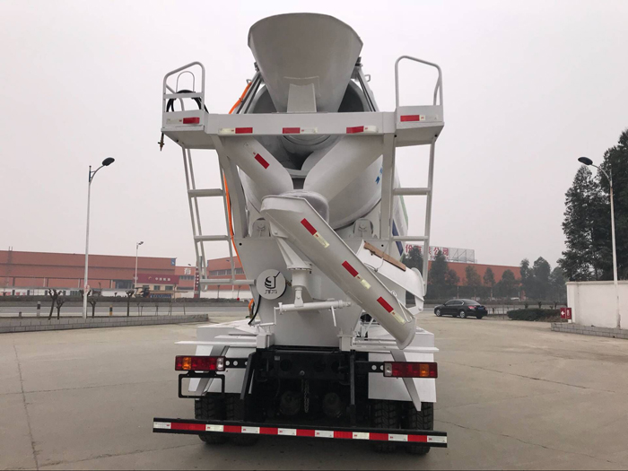 整車尾部的出料斗(又稱卸料槽)正對出料斗,出料斗與攪拌罐緊密接合,出料斗可根據(jù)需要隨意調(diào)整出料方向。出料口處配裝有180°翻轉(zhuǎn)的加長槽,延長出料斗的長度,不用時可通過操縱桿折疊翻轉(zhuǎn)固定,節(jié)省空間且方便使用。